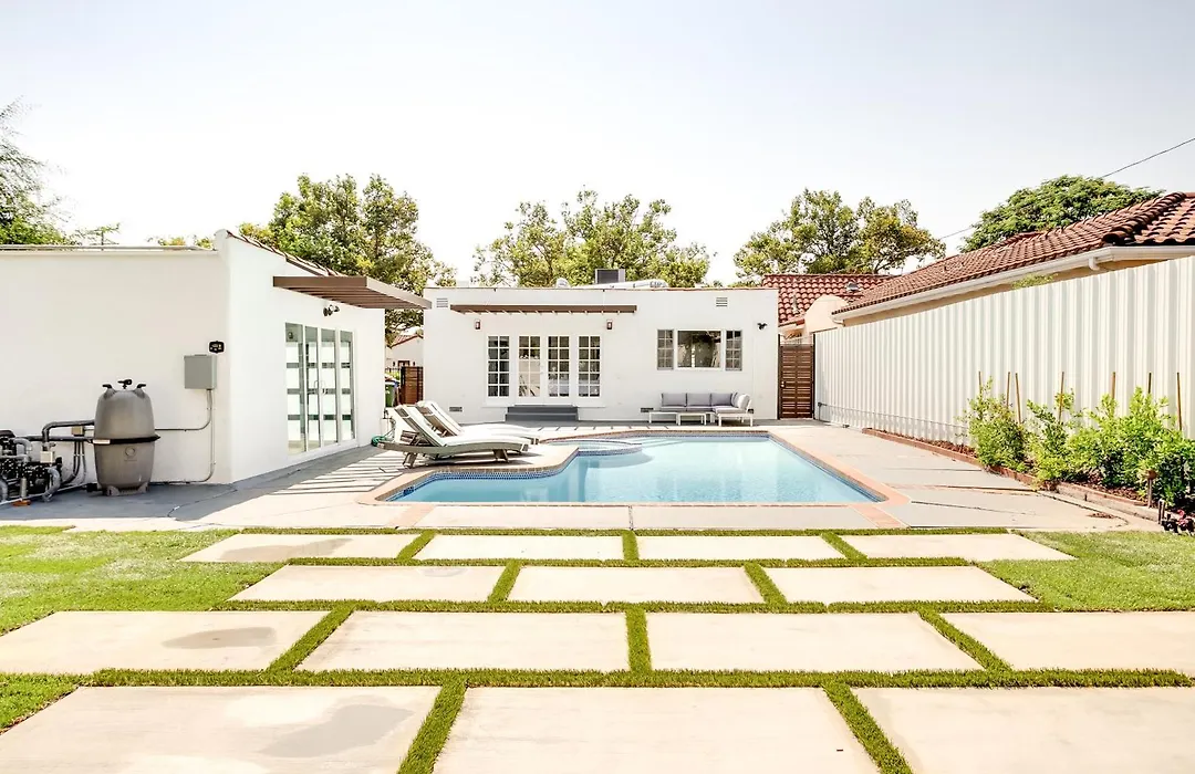 ベッドルーム2室のロサンゼルス Monthier Melrose Po7H2O0ヴィラはザ・グランドリングスから歩いて6分のところに位置し、テラスやプライベートなプールを楽しむことができます。